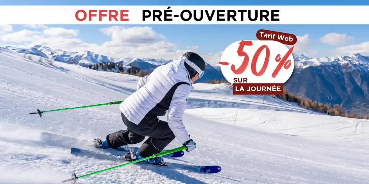 Profitez des premières glisses à prix réduit : -50% sur votre forfait 1 ou 2 jours les 6 et 7 décembre ! Tarif web, offre valable uniquement sur le domaine Risoul 1850.