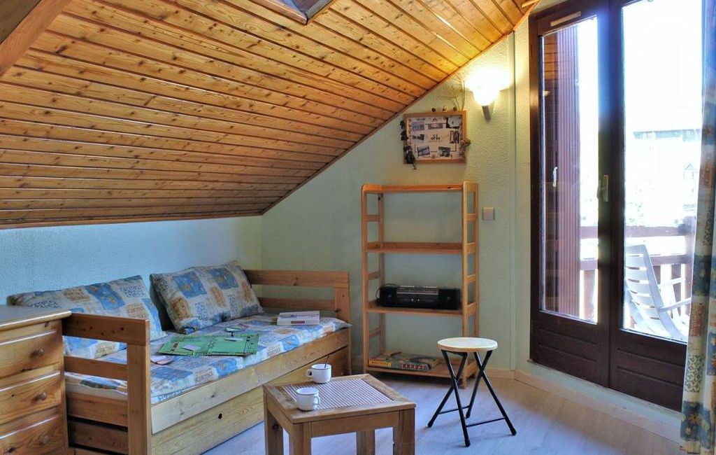 Situé au 6° étage d'une résidence aux départs des pistes, l’appartement se compose d’une petite chambre en sous pente avec un clic-clac 2 places, d’un canapé convertible et d’un lit gigogne 2 places dans le séjour, d’une kitchenette équipée ainsi que d’un WC et d’une salle de bain indépendants. L'appartement dispose aussi d'un casier à ski.