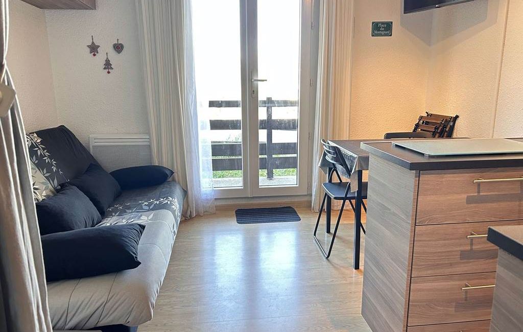 Studio situé rez-de-chaussée dans une résidence au calme, et proche des pistes. Il s'organise autour de deux lits superposés dans un coin montagne, d'un canapé clic-clac dans la pièce de vie avec la télévision, et d'une cabine avec un lit double.