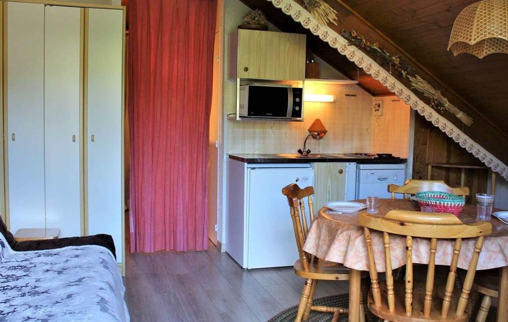Situé sur le secteur du bas de station, les couchages de cet appartement s’organisent autour de deux lits superposés une place dans l'entrée, séparé du séjour par un rideau. Dans celui-ci, il y a un canapé convertible clic-clac 2 places, une cuisine équipée et une télévision. Les WC sont indépendants de la salle bain.