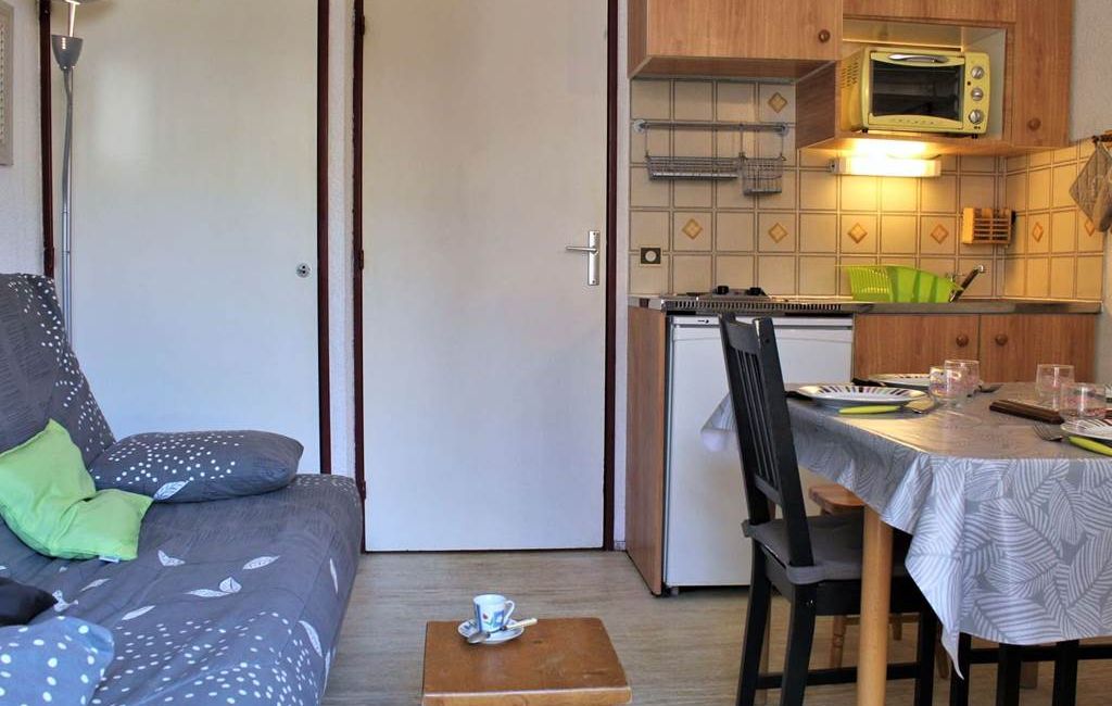 Situé à l’entrée de la station, l’appartement se compose d’un séjour avec un canapé convertible deux places, d’un coin montagne à l'entrée avec un lit superposé soit 2 couchages simples, d’un coin cuisine équipée, d’une salle de bain avec baignoire et d’un WC indépendant. L'appartement dispose aussi d'un casier à ski.