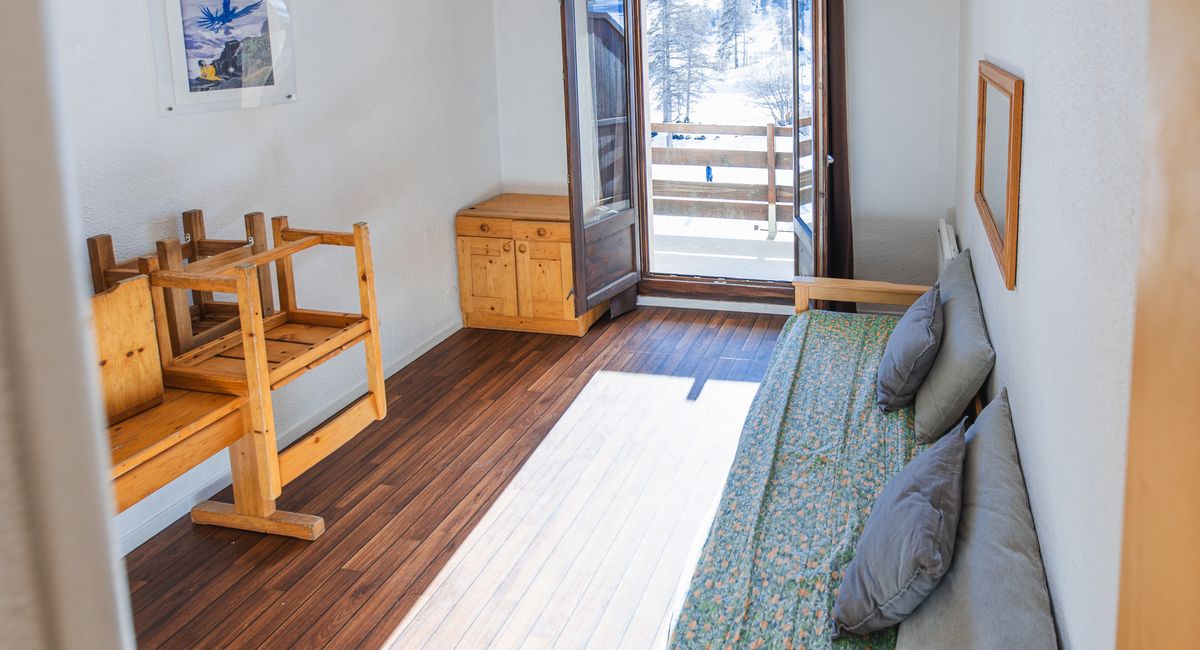 This studio apartment for four people comprises a sleeping alcove at the entrance with a bunk bed, a living room with two pull-out beds, a kitchenette, a bathroom, and a separate toilet. The apartment has a large balcony with views of the Risoul ski slopes. A ski locker is available in the residence, providing direct access to the Risoul slopes (ski-in/ski-out).